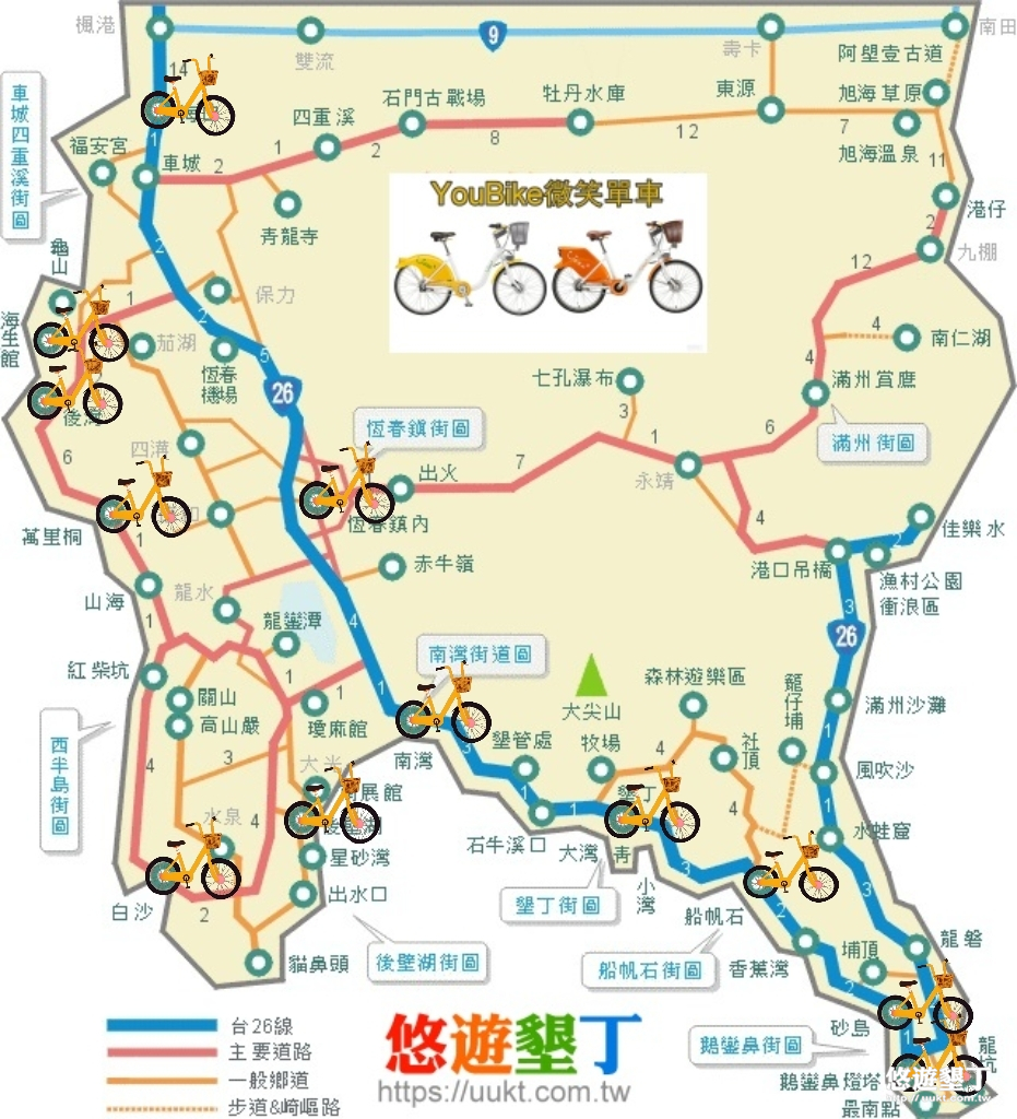 YouBike最早開發市場是從大城市台北開始,主要台北人口密集,分別12個轄區,交通發達的市,也便利了人民在交通上短程距離的轉換工具,而恆春鎮2023年6月終於也有YouBike進駐了,真的便利了好多來恆春墾丁旅遊的國內外遊客,設站處包括恆春轉運站、南門郵局、恆春立體停車場、恆春工商學校、恆春東門古城、恆春西門古城、恆春北門古城、恆春1號兒童公園、山腳里社區活動中心、恆春旅遊醫院、南門醫院、恆春監理站、出火地質公園、南灣休憩區、大光活動中心、後壁湖漁港、萬里桐悠活渡假村、白砂大客車停車場、墾丁大灣路口、小灣遊客服務中心停車場、小灣沙灘對面、船帆石、砂島、鵝鑾鼻公園停車場、國立海洋生物博物館、車城後灣村、車城看海美術館 等多站處,騎乘YouBike不管你要到哪一個景點,即使搭不上公車或是公車不到的地方,現在恆春有提供YouBike 2.0、YouBike 2.0 E電輔車,真是造福恆春的觀光市場~